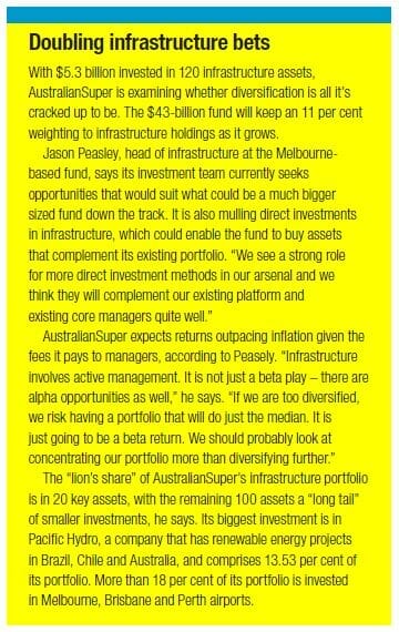 The fund aims to invest 11 per cent of its capital in infrastructure and will maintain this weighting as it grows in size. To do this, AustralianSuper may need to bypass pooled funds and invest directly in assets, particularly in Australia, where it is looking to increase its exposure to core infrastructure, Peasely says.