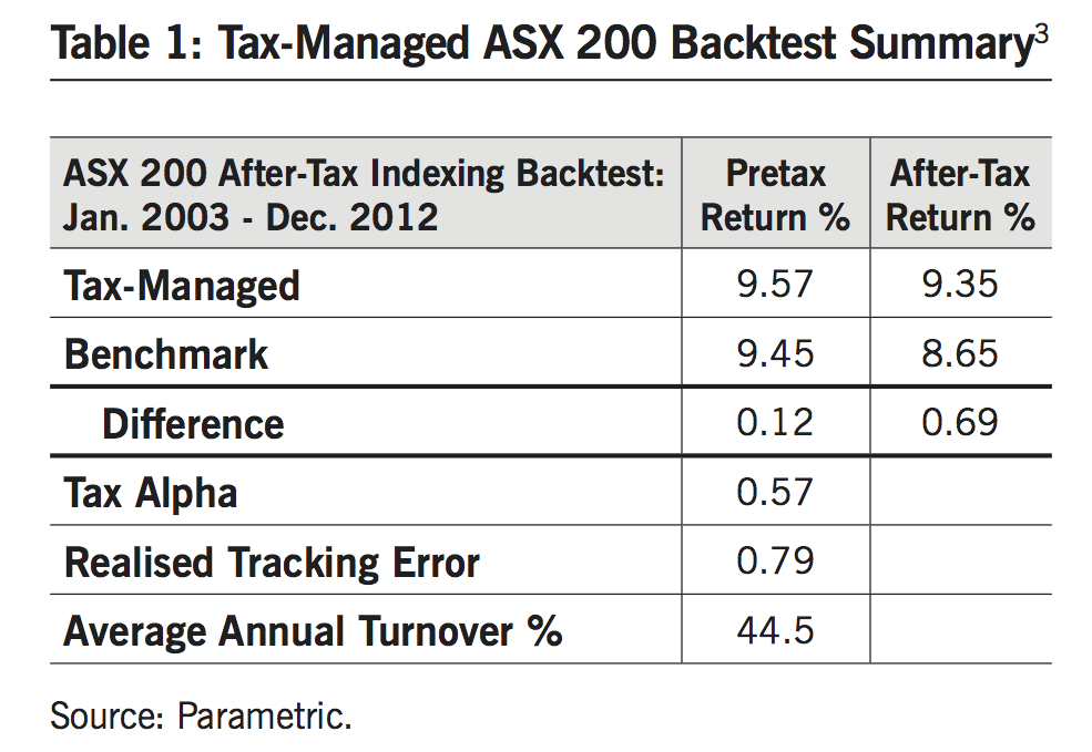 Active tax management can be used to enhance after-tax returns of indexed Australian and international equity portfolios for superannuation funds. The systematic and prudent implementation of tactics such as capital-gains/loss management and holding-period management can add real after-tax value. Simulations and back tests carried out by Parametric consistently demonstrate added value in the range of 30bps to 90bps of after-tax alpha on an annual basis.