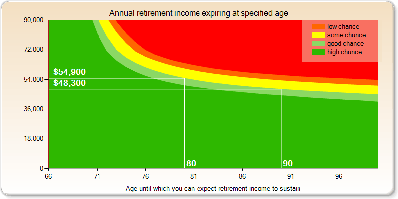 The different coloured regions reflect the likelihood of Bill (from the BBQ conversation) drawing a specified retirement income (shown on the vertical axes) to a specified aged (along the horizontal axes). In this case Bill has a good chance of drawing $48,300 to age 90. If Bill wanted to consider the income he has a good chance of drawing to age 80, the diagram shows it is $54,900. Essentially, the coloured regions demonstrate that future outcomes are uncertain. As Bill explores the impact of different investment strategies, he will observe that the width of the coloured regions will expand for strategies with higher investment risk and the “middle” yellow region generally moves up, and visa versa.