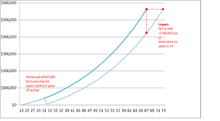 The $40,000 deposit would wipe out the first nine years of young adult’s super savings (assuming a starting salary of $50,000) with $100,000 lost in compound interest from their retirement savings.