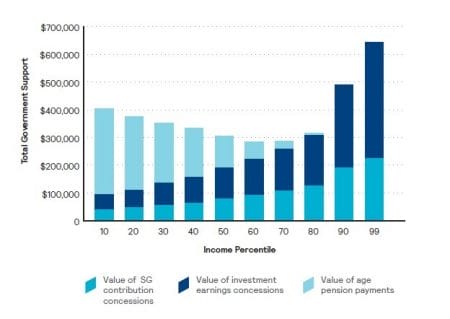Treasury officials admit that if a cap was introduced the government should not expect to receive the equivalent in tax as concessions in superannuation (see graph below from AIST-Mercer’s Super Tracker which shows current government concessions over a person’s lifetime based on their income percentile) because a cap will alter investment behaviours.