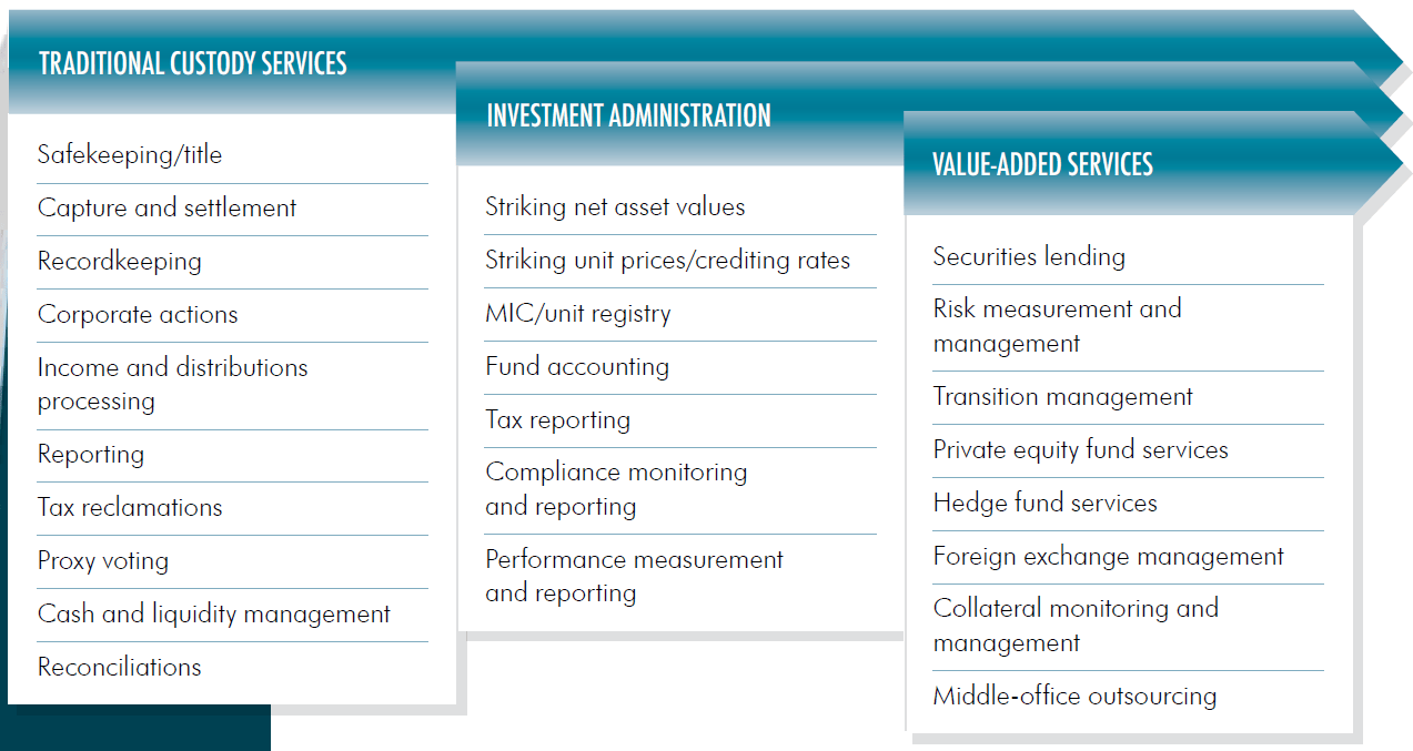 Typical services are summarised in Figure 1 (click to enlarge). Key emerging areas include middle-office outsourcing, risk analytics and support in management of direct assets.