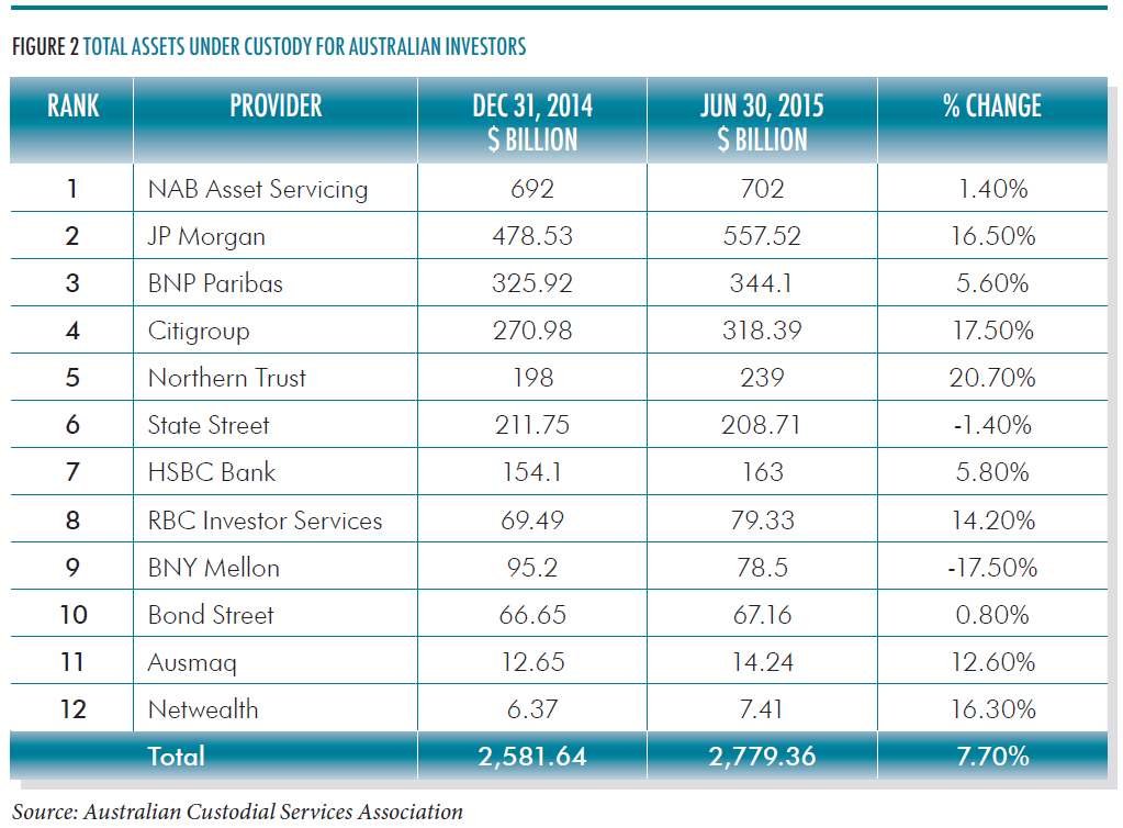 The custody market has continued to grow relentlessly, with total assets under custody approaching $2.8 billion at the end of the 2015 financial year. NAB Asset Servicing continues to be the largest provider, but faces intense competition from global providers which have committed to a substantial on-the ground presence in Australia. Six custodians now each hold over $200 billion of assets under custody for Australian investors (see Figure 2, click to enlarge). The range of providers who have been attracted to the market reflects the robust growth of Australia’s savings pool, with Australia now having (by assets) the fourth-largest funded superannuation system in the world.