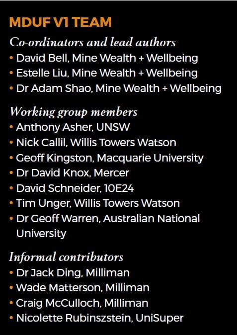 This was the idea behind the Member’s Default Utility Function Version 1 (MDUF v1) project. We as funds typically know little about our default members. MDUF v1 is a framework developed to address this. A panel of academics and industry professionals has established it to determine an appropriate, sensible set of objectives for trustees to assume on behalf of their default fund members. The panel (detailed in the box) has more than 200 years of relevant experience.