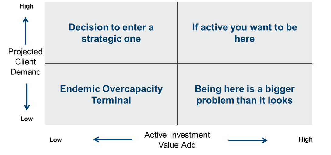He suggests that an active manager needs a prism to assess itself, as demonstrated in this chart – on the vertical axis is the projected client demand and on the horizontal axis is active investment value add.