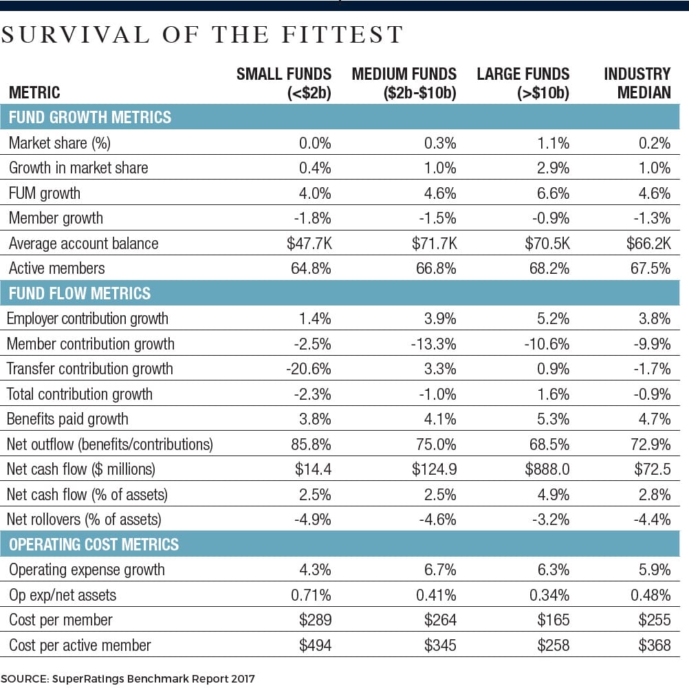 The SuperRatings research shows that while bigger isn’t always better, it is certainly true that smaller funds are more likely to be struggling to pass the scale test.