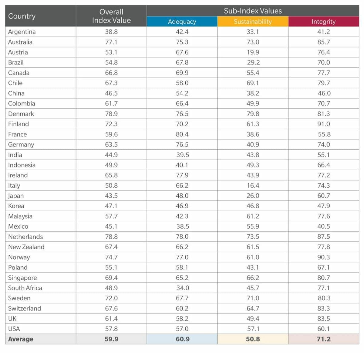 The index is based on research to assess the pension systems of 30 countries, collectively representing 60 per cent of the world’s population. It considers both public and private pension systems. In 2017, New Zealand, Colombia and Norway were included in the index for the first time.