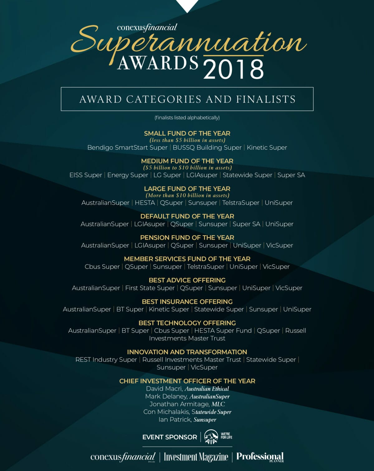 The 2018 Conexus Financial Superannuation Awards are sponsored by event partner AIA Australia. All the winners will be announced at a special black-tie event on March 8 at the Ivy Ballroom, Sydney. Tickets are now available. To book, click here.