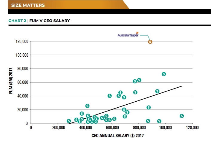 Chart 2 shows analysis by Investment Magazine that plots CEO pay relative to fund size, as measured by funds under management. Those dots above the trend line indicate funds where pay was below average relative to fund size. Silk stands out as the best ‘value’ chief on this measure.
