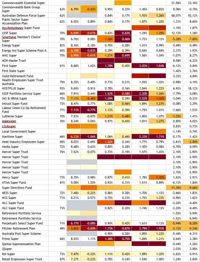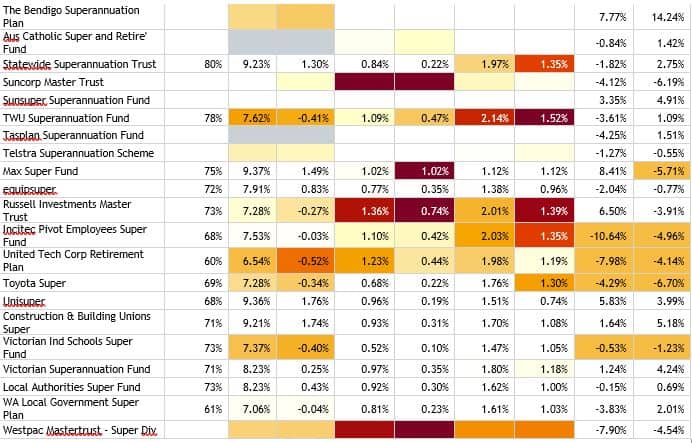Maritime Super, EISS Super and Christian Super are among a handful of MySuper funds that flashed dark red on the regulator’s gradient colour scheme, which shows the degree of underperformance relative to benchmarks. Other funds flagged included LUCRF, Perpetual Super and a number of retirement wrap products managed by BT Funds that includes Westpac Group Plan MySuper.