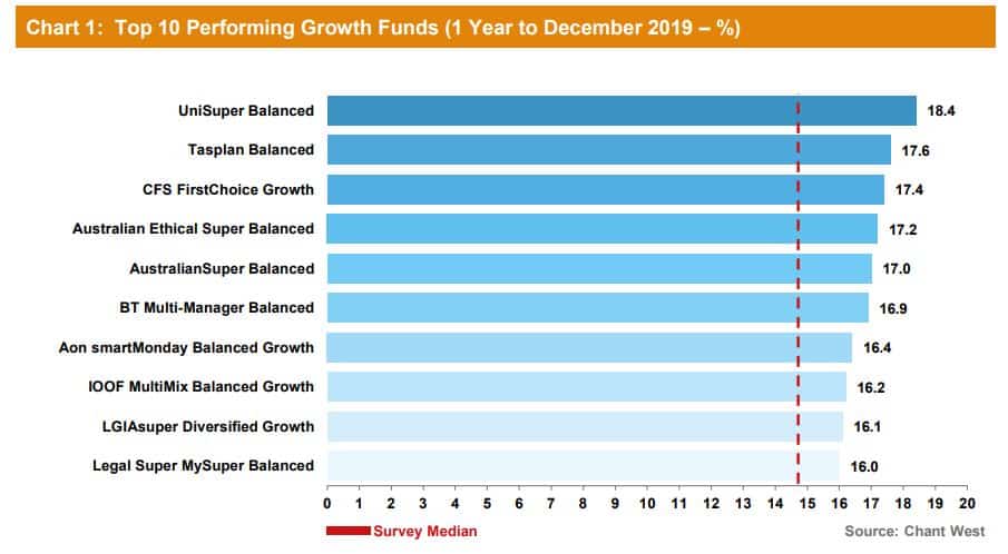 UniSuper’s $26 billion balanced fund topped Chant West’s best performance list for 2019 thanks to its high allocation to listed equities.