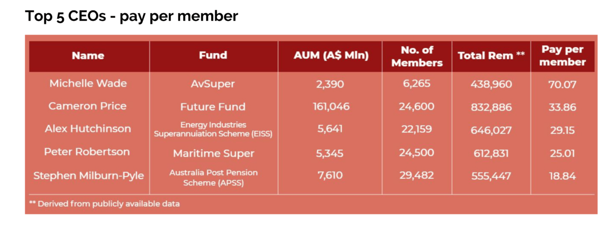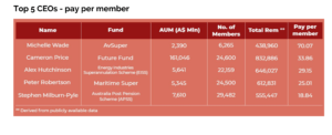 On a pay-per-member basis superannuation fund CEOs Michelle Wade from AvSuper, Alex Hutchison from Energy Industries Superannuation Scheme (EISS) and Peter Robinson from Maritime Super are among the highest paid CEOs, the analysis shows.