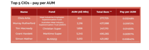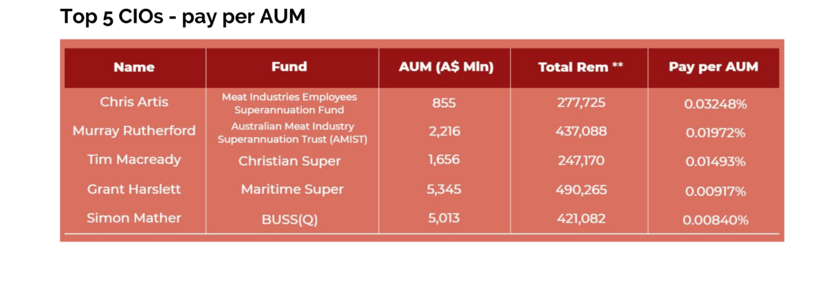 Meanwhile, on an assets under management basis, CIOs including Meat Industry Employees Superannuation’s Chris Artis, Christian Super’s since outgoing Tim Macready and Maritime Super’s Grant Harslett are among the highest paid investment team executives as is Australian Meat Industry Superannuation Trust’s Murray Rutherford.
