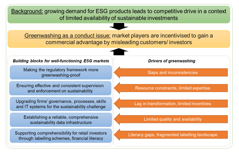 ESMA said the risk is exacerbated by inadequacies in the regulatory framework such as unclear, ambiguous definitions of certain concepts; lack of standardised calculation of metrics; minimum standards failing to support the ambition level, such as for climate benchmarks; and the absence of regulation for certain widely-used concepts such as “impact investment”.