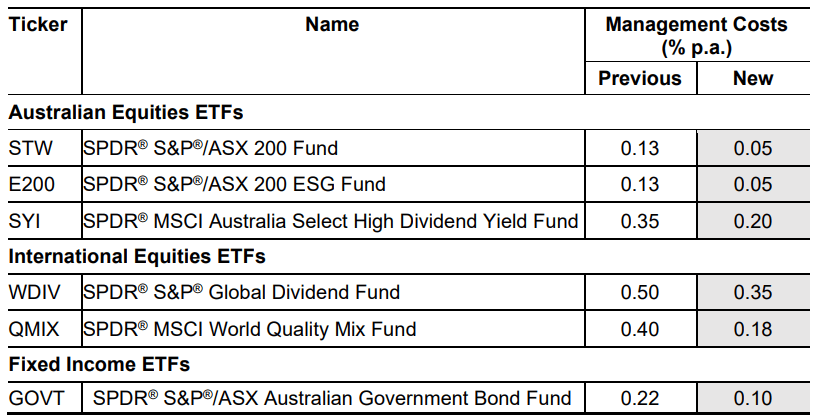 Asset management business State Street Global Advisors has announced substantial management cost reductions on six of its Australian-based SPDR ETFs.