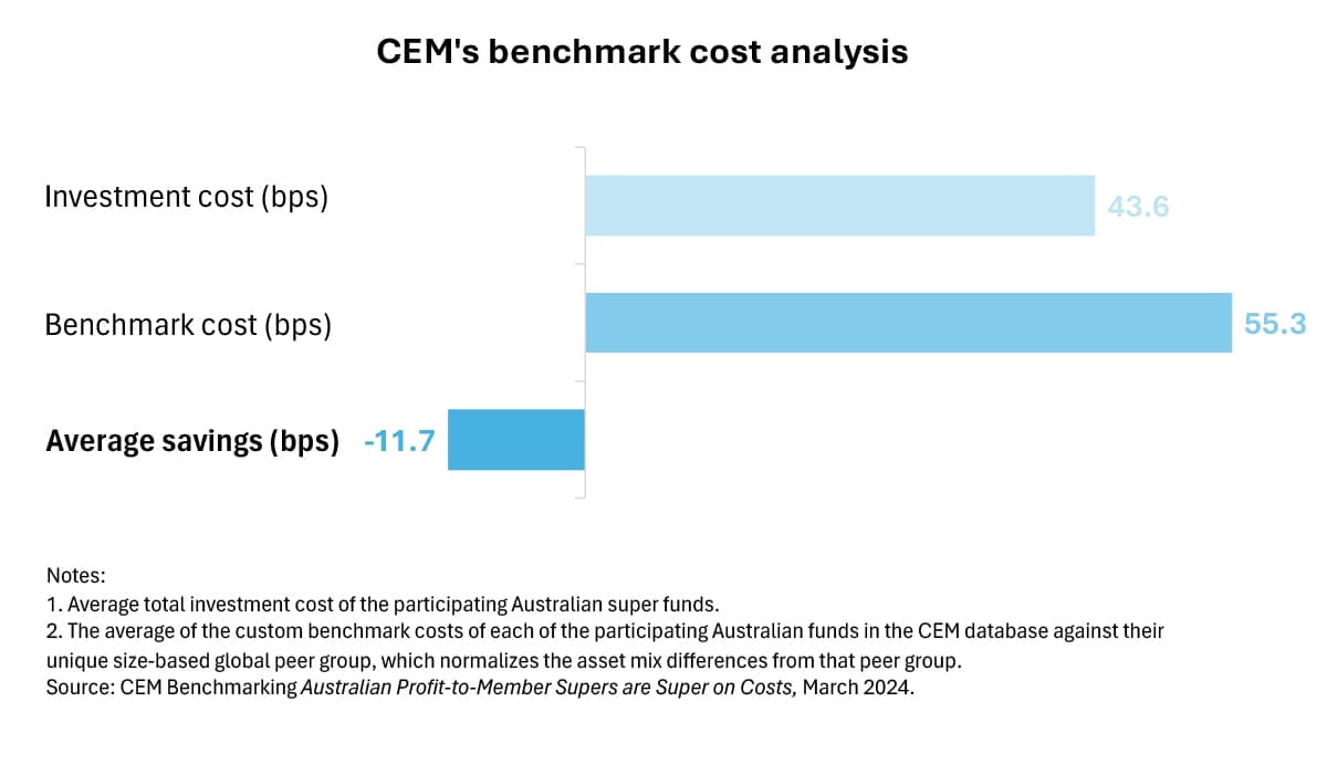 Australian superannuation funds are using their clout and negotiating power to drive down costs, with CEM saying savings are “partly due to using lower cost evergreen/core fund structures in real assets, and more prominently, due to lower external manager fees in public and private market asset classes”.