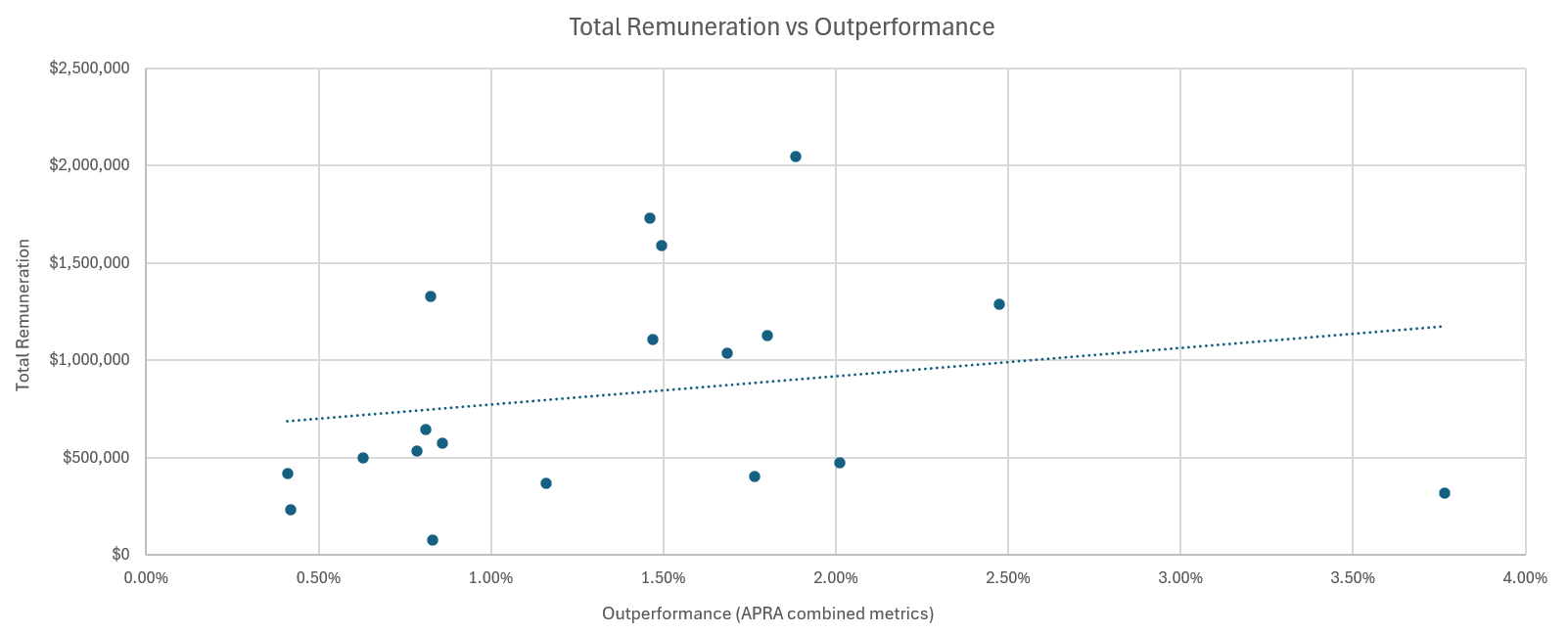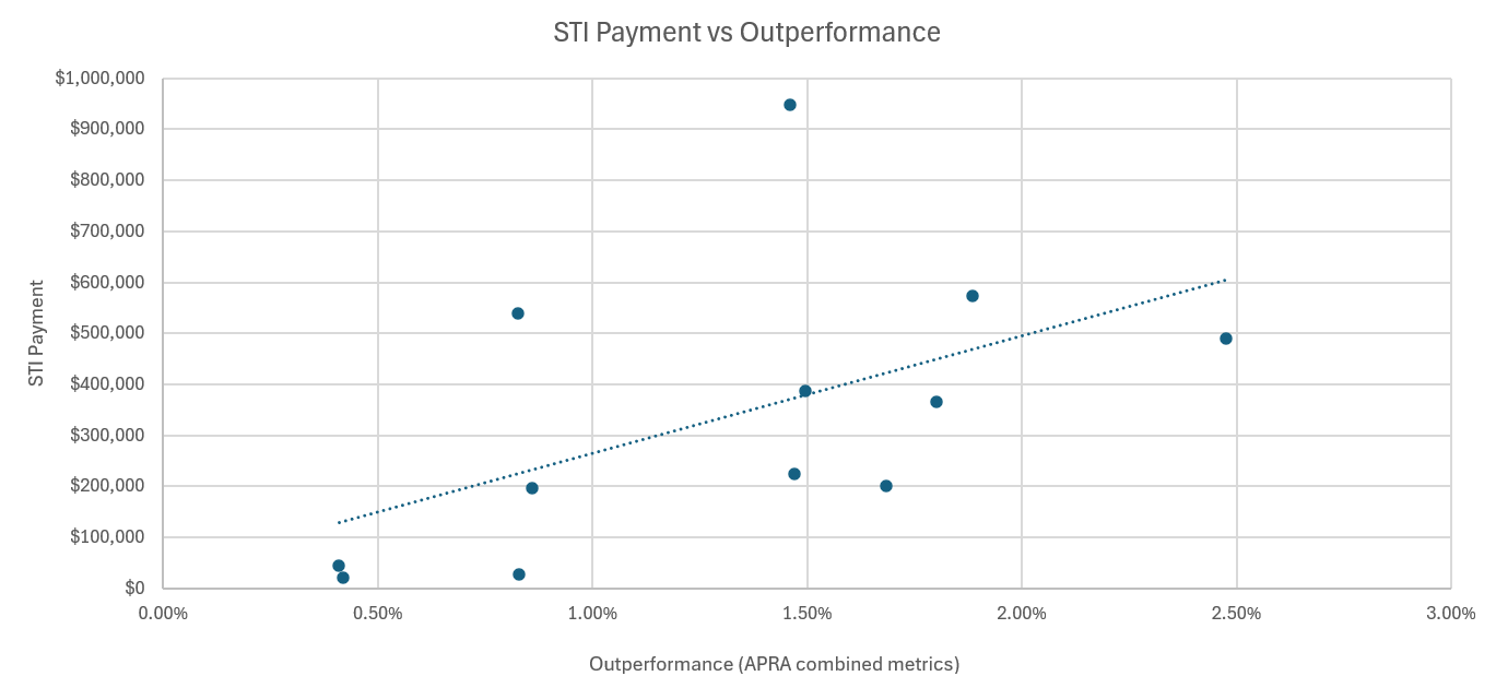 Investment Magazine analysis of the APRA-sourced salary data has found that there is a correlation, albeit loose, between CIOs’ total remuneration and outperformance, and between their short-term incentives and performance, as demonstrated by the charts below.