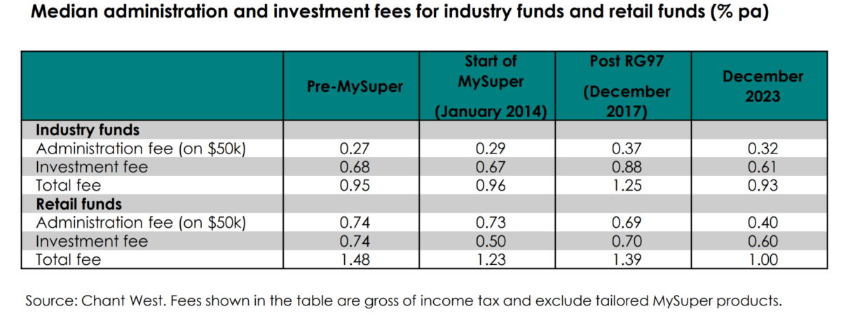 The research house says regulation has put effective pressure on funds to cut fees, with the median total fee for retail funds falling by 48 basis points in the decade since MySuper was introduced, while the median industry fund fee dropped 2 basis points.