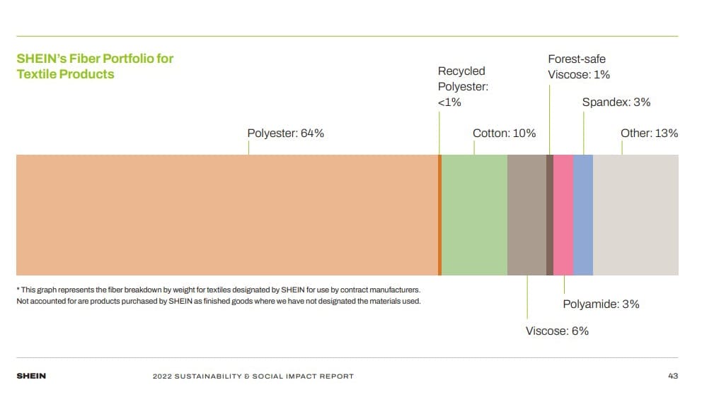 While there is a lot of focus on SHEIN’s cotton use, almost two-thirds of SHEIN’s garments are actually made from polyester, a fabric that is derived from petroleum (i.e. fossil fuels).