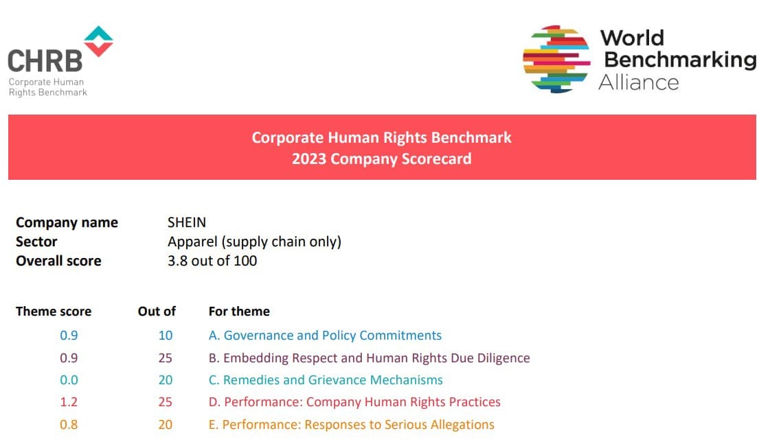 The World Benchmarking Alliance’s human rights scorecard below is typical of the sort of (poor) ratings SHEIN receives from advocacy groups.