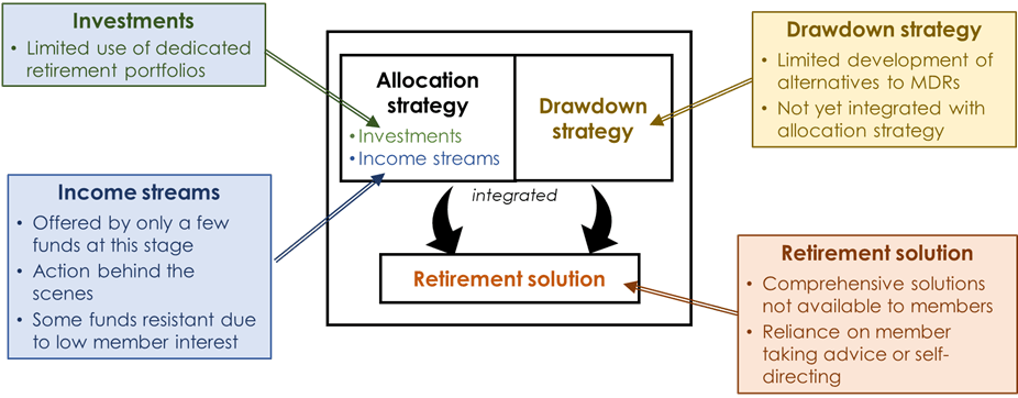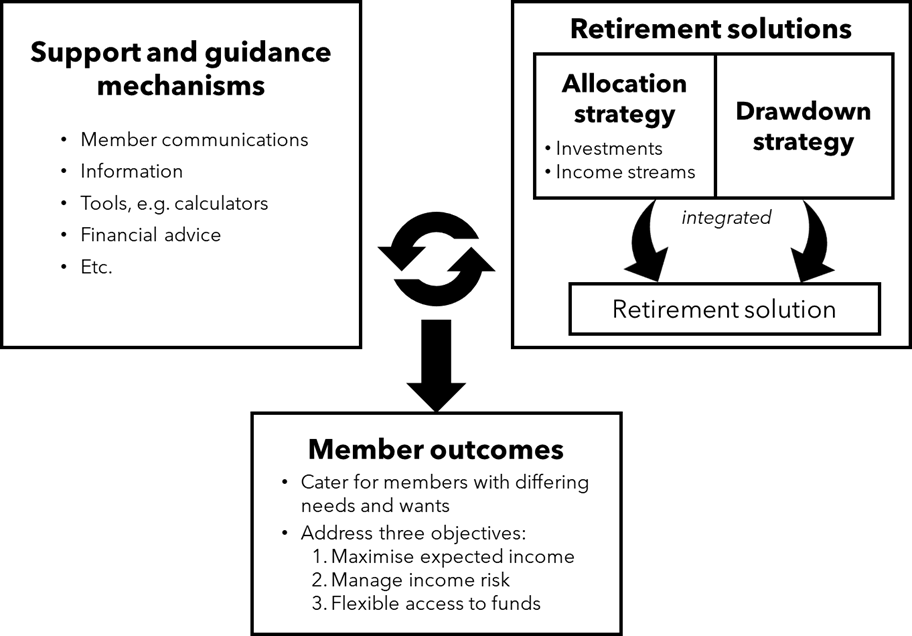 Both sides of our first diagram are important, and need to work in tandem. The left side of guidance and advice is an important enabler of the right-hand side. The right side of retirement solutions is what delivers the actual outcomes through retirement (you can’t eat advice). Members need to be in the solution that suits their needs, and for that solution to deliver good outcomes.