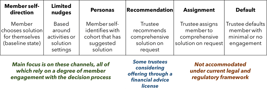 While we are seeing the use of limited nudges, most seem to be activity-based rather than offering financial recommendations. Examples of activity-based nudges prompt members to seek information or initiate application processes, often within the framing of ‘member journeys’. The hesitancy around using nudges to support financial decisions appears motivated by concern over legal and regulatory risk and recognition that member circumstances can be complex. These considerations arguably leave other mechanisms on the above diagram as ‘safer ground’ for trustees.