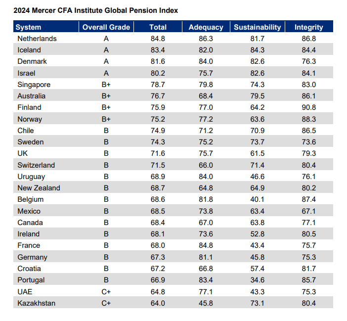 Netherlands, Iceland, Denmark and Israel retained their A-ratings as some of the best pension systems in the world.