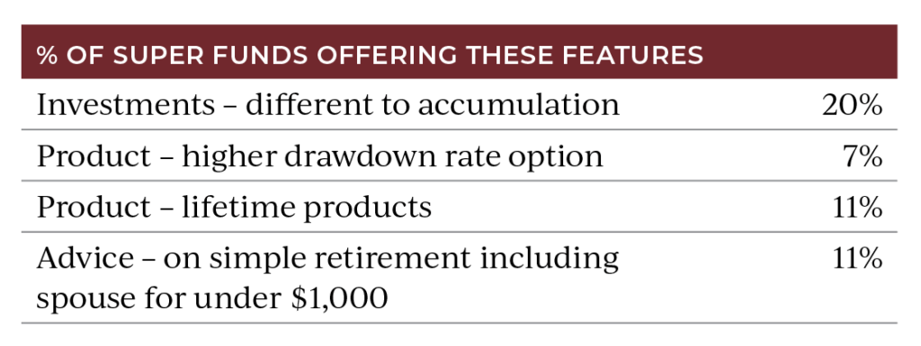 Another aspect of product is the drawdown rate – the level of annual income drawn down by each member. The pension application forms in most funds set up the legislative minimum rates as a quasi-default and about 50 per cent of members take that. But many retired members could have a much higher standard of living than they currently have. AustralianSuper and NGS Super, for example, offer a set of higher drawdown rates to address this issue.